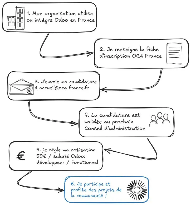 - L’adhésion est ouverte aux personnes morales (entreprises, associations, etc.) actives dans l’écosystème Odoo.